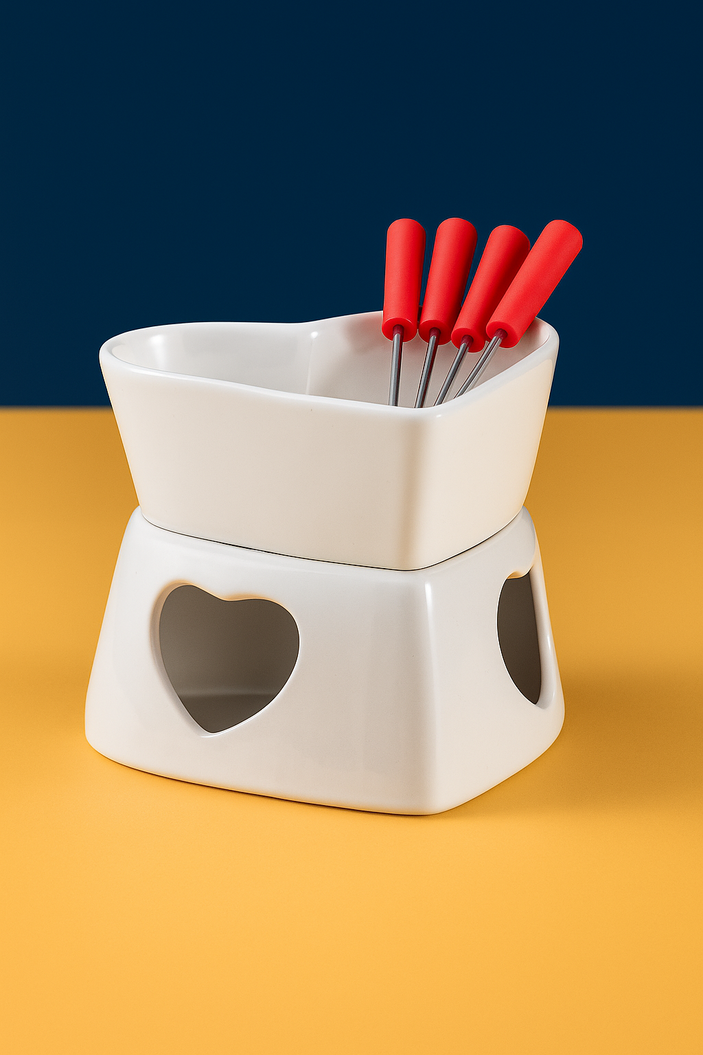 Com bowl em formato de coração e base em cerâmica, ele mantém o calor de forma eficiente e uniforme. Ideal para porções individuais ou para compartilhar em encontros íntimos, o conjunto ainda acompanha garfos, suporte e vela, pronto para criar experiências inesquecíveis.